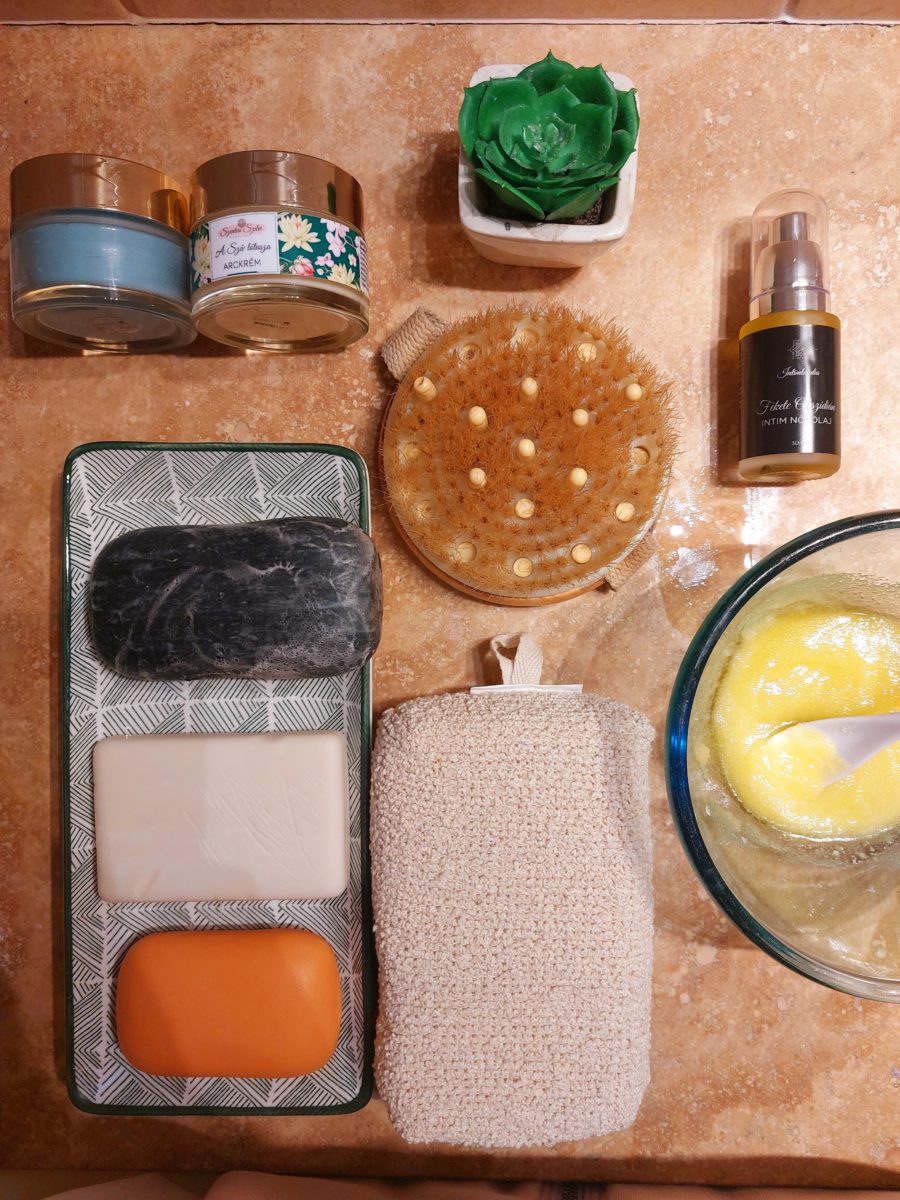 Készíts ki egy fekete és egy fehér szappant, a száraz és a fürdő szivacsot, az intim olajat és a két krémet.